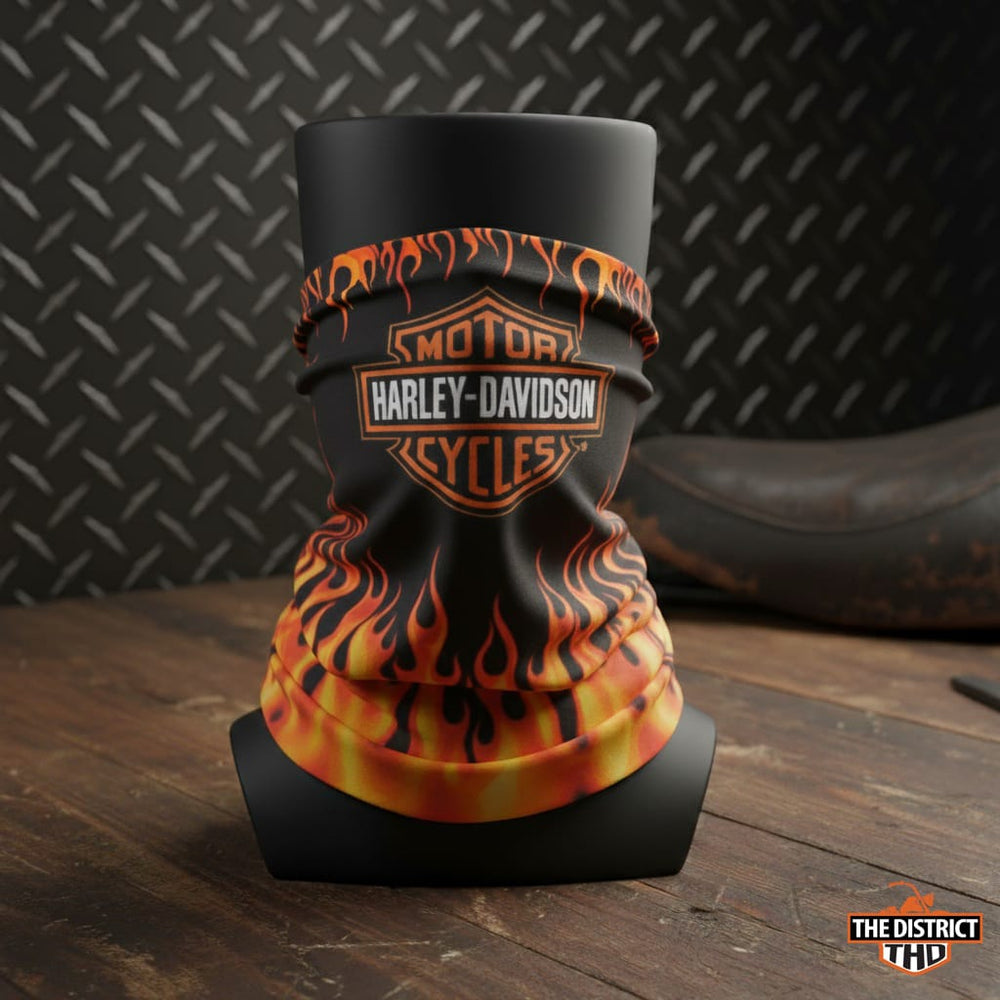 The Blazing Flames bandana features flame graphics across a dark base, combined with the Bar & Shield logo in a bold, block layout. The design has a worn texture that gives it a slightly aged, rugged look.